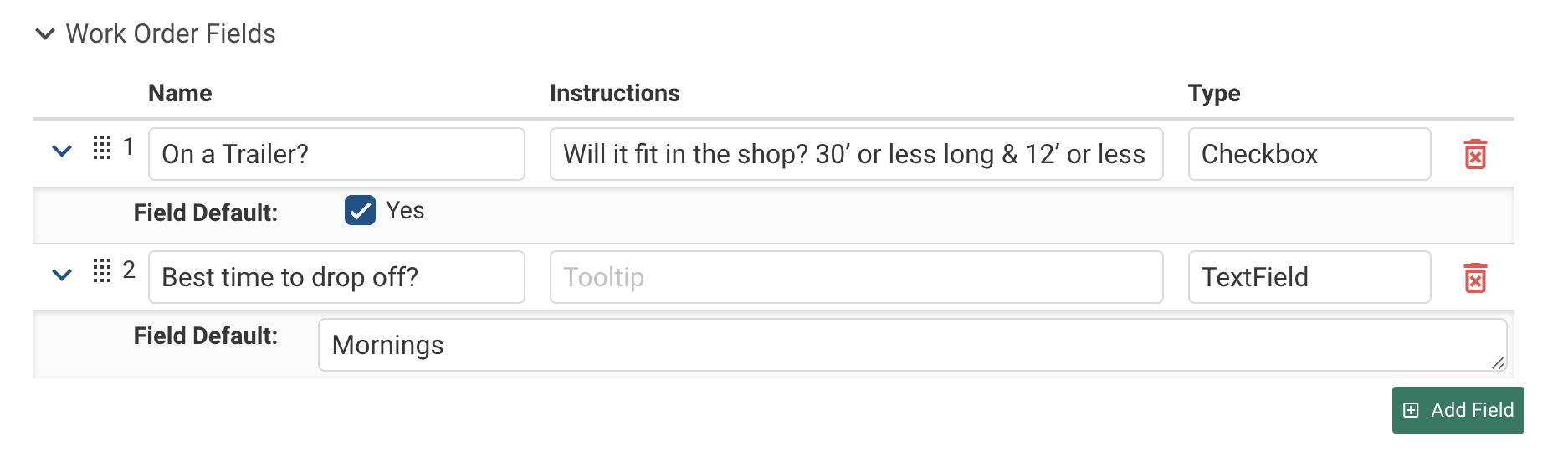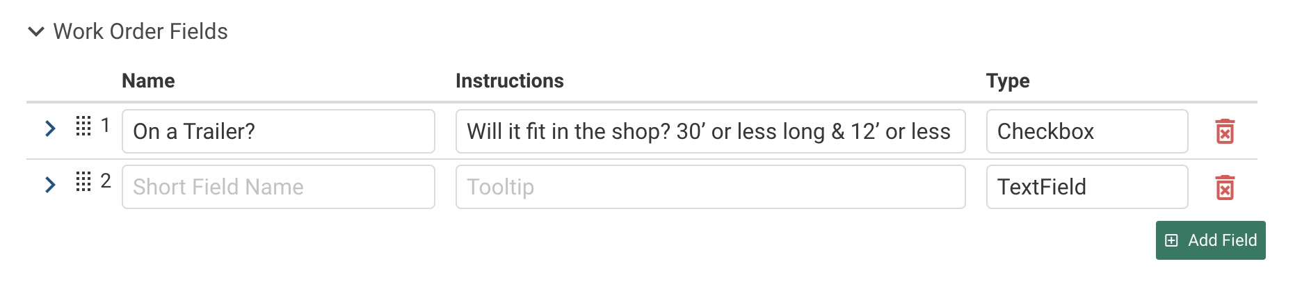 To add a field to a job or work order, click the [+] Add Field button on the job or work order page.
